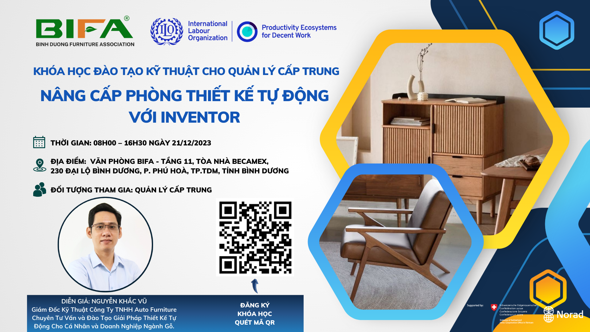 VP BIFA - Tổ chức Lao động Quốc tế (ILO) - Auto Furniture, trân trọng thông tin và kính mời Quý Doanh Nghiệp đăng ký tham dự "Khóa Học Đào Tạo Kỹ Thuật Cho Quản Lý Cấp Trung Nâng Cấp Phòng Thiết Kế Tự Động Với Inventor" với thông tin như sau:
